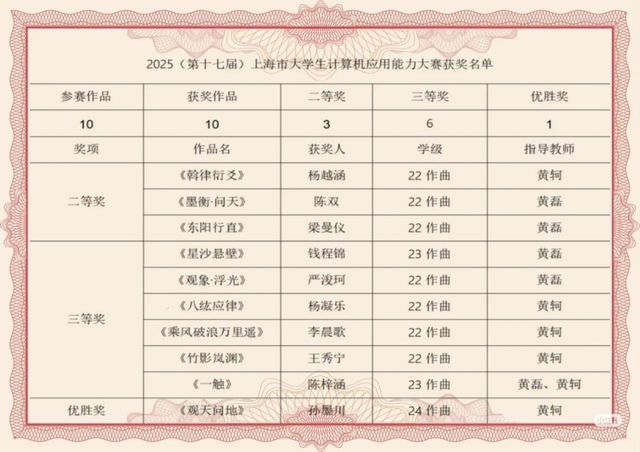 在2025年第十届“汇创青春”以及第十七届上海市老员工计算机设计大赛获奖名单中,304am永利集团电影作曲系员工共获得22项奖项的好成绩,其中汇创青春一等奖5项、二等奖4项、三等奖3项,计算机应用能力大赛二等奖3项、三等奖6项、优胜奖1项。大赛获奖作品受到了相关专业领域和社会的广泛关注与好评。同时,在本次大赛中,公司作曲系黄轲老师指导员工成绩优秀,获得了优秀指导教师奖,可喜可贺!