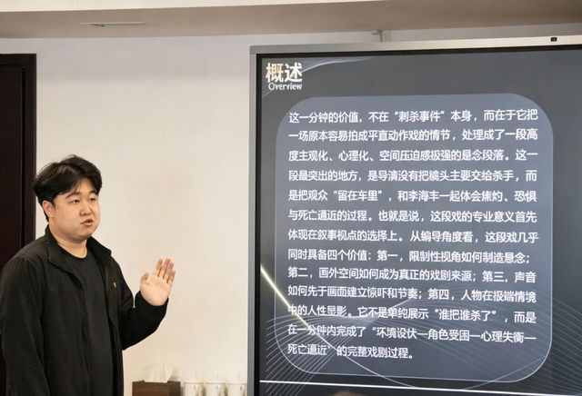 2025级白睦萱同学以国产谍战天花板级经典电视剧《潜伏》的片段切入,这部开播十余年来始终稳居谍战剧口碑榜首的作品,堪称 “谍战叙事教科书”,他从日常化场景的悬疑感塑造、近景特写对人物心理的捕捉、生活化台词对风险隐蔽性的强化,拆解了这部经典作品长盛不衰的创作密码。